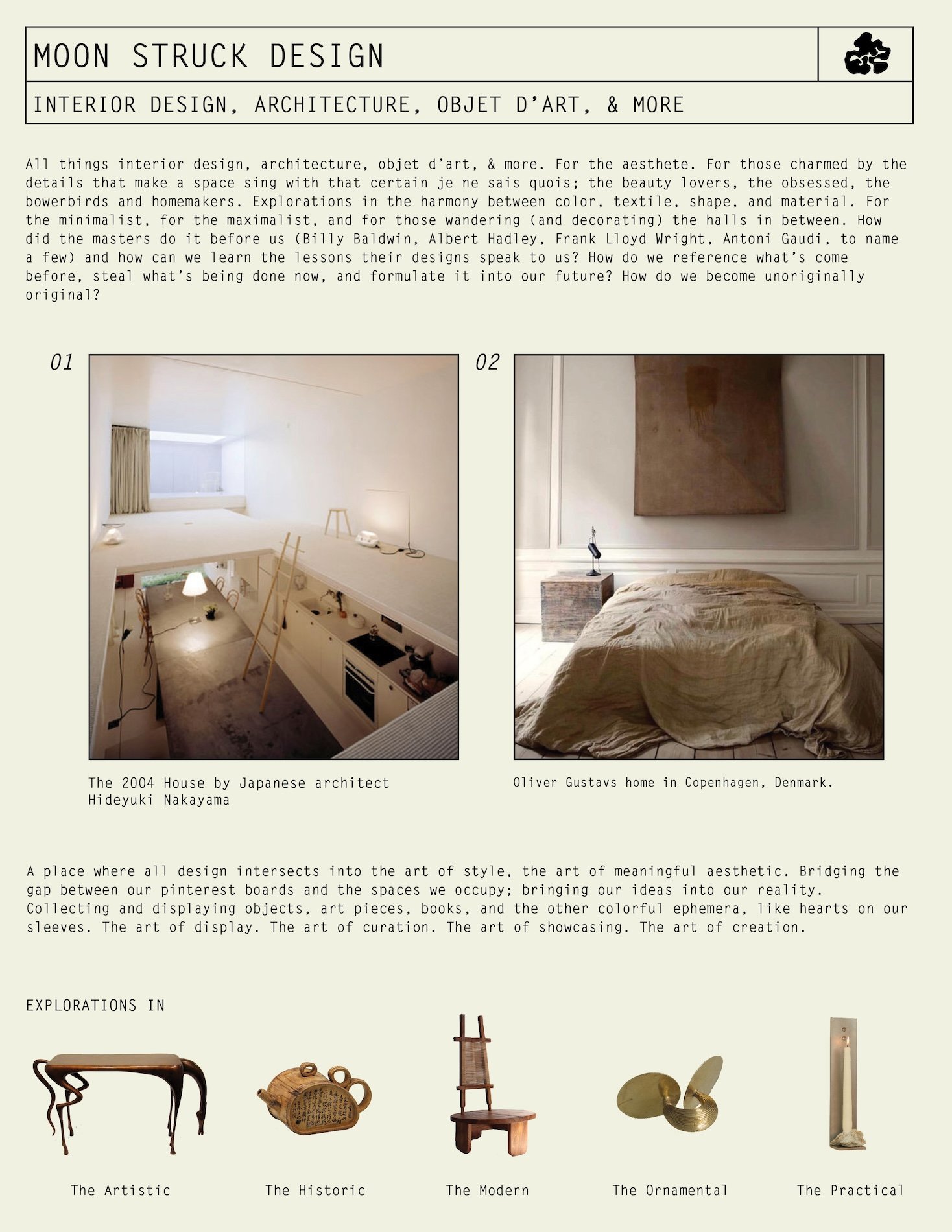 For those charmed by the details that make a space sing with that certain je ne sais quois; the beauty lovers, the obsessed, the bowerbirds and homemakers. Explorations in the harmony between color, textile, shape, and material. For the minimalist, for the maximalist, and for those wandering (and decorating) the halls in between. How did the masters do it before us (Billy Baldwin, Albert Hadley, Frank Lloyd Wright, Antoni Gaudi, to name a few) and how can we learn the lessons their designs speak to us? How do we reference what's come before, steal what's being done now, and formulate it into our future? How do we become unoriginally original?